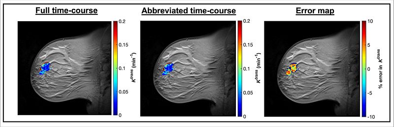 Background: Breast MRI demonstrates superior sensitivity for breast cancer detection; however, high costs limit its use as a screening tool. Abbreviated MRI was introduced as a screening alternative (see Kuhl et al.) with similar sensitivity levels, but the absence of delayed post-contrast phases may impede quantitative characteristics of tumor perfusion known to have important diagnostic value.